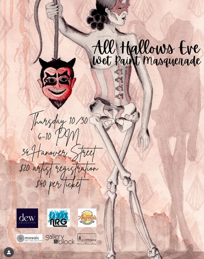 All Hallow’s Eve Wet Paint Masquerade, The Dew Collective, Manchester, NH โ Join us on All Hallow’s Eve, Thursday, Oct. 30 from 6-10 pm at Dew Collective, 34 Hanover Street, for a Wet Paint Masquerade. The event will include live painting by local artists, DJ Greg, a wine and cheese tasting, and dance performances. Dress to impress in the Halloween spirit and interpret that any way you choose! Come one, come all! $40 entrance provides access to exclusive art finished with you in attendance. Wine and cheese tasting provided with ticket. Get tickets here.