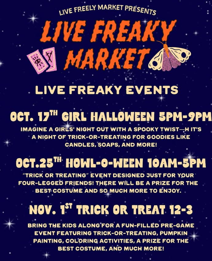Live Freaky Market’s Trick or Treat, Live Freely Market, Hampton, NH โ Join for a Trick or Treat event on Saturday, Nov. 1 from 12โ3 pm. A family-friendly kickoff before the big night! Bring the kids for trick-or-treating, pumpkin painting, coloring activities, best costume prizes, and so much more!