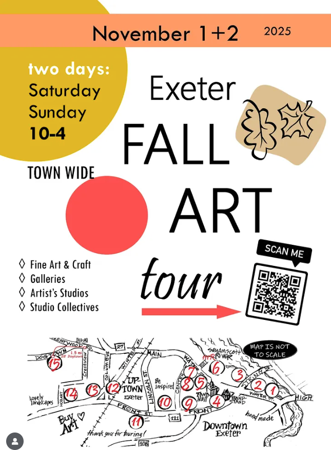 Exeter Fall Art Tour, Downtown Exeter, NH โ Mark your calendars for two incredible days of art and culture in beautiful New England at the Exeter Fall Art Tour. All locations are within a 3 mile stretch from beginning to end! Saturday, Nov. 1 & Sunday Nov. 2 from 10 am to 4 pm both days. With a spotlight on fine art and fine craft, you can see Exeter’s vibrant local galleries, studio collectives, and individual artist studios. More info here.