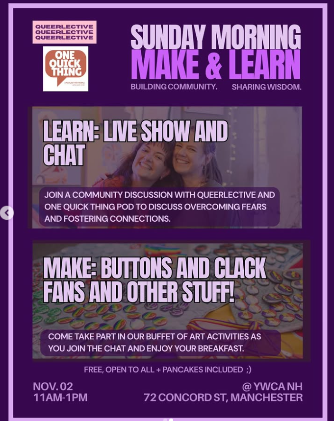 Sunday Morning Make & Learn, Queerlective, Manchester, NH โ What happens when you step outside your comfort zone and it actually pays off? Join us for our next Sunday Morning Make & Learn on Sunday, Nov. 2 from 11 amโ1 pm at YWCA NH (72 Concord St, Manchester) for a community conversation with Marissa and Emily from One Quick Thing: A Podcast for People Who Care a Lot. Marissa and Emily will share how One Quick Thing came to life, and Randall will talk about the scary-but-worth-it process of starting Queerlective. Then weโll open the floor for community stories about growth, risk, and the unexpected good that comes from saying โwhy not?โ This gathering might even become a future podcast episode! Free to attend, donations welcome. Light breakfast and creative activities provided. RSVP at go.queerlective.com/onequickthing. (Stop by The Moka Pot in Manchester on Nov. 2 and tell the barista you’re attending the Make and Learn for a 20% discount!)