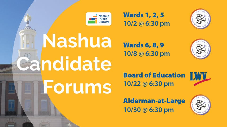 Nashua Candidate Forum, Nashua Public Library, Nashua, NH โ Meet the candidates for Alderman-at-Large, hear why they’re running, and ask them your questions in this public forum. Co-sponsored by Nashua Ink Link. This forum will take place on Thursday, Oct. 30 at 6:30 pm. Additional viewing options: The forums will also be livestreamed on Nashua ETV and available on-demand at nashuanh.gov, Channel 22 on Xfinity/Comcast, and on ROKU, Apple TV, Fire Stick, and Mobile Apps by searching for โNashua Community Media.โ