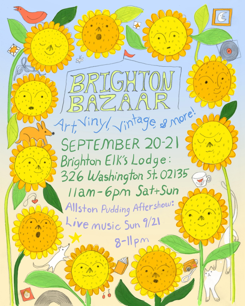 The Brighton Bazaar, Brighton Elk’s Lodge, Brighton, MA โ Join for art, vinyl, vintage finds and more! The bazaar will take place Sat. & Sun, Sept. 20 -21, from 11 am – 6 pm at Brighton’s Elk Lodge. Following the event on Sunday, there will be live music at the Allston Pudding Aftershow from 8 pm – 11 pm.