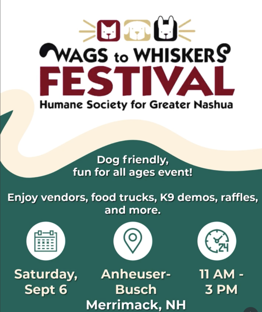 Wags to Whiskers Festival, Humane Society of Greater Nashua, Anheuser Busch, Merrimack, NH – 11 a.m. – 3 p.m. – Wags to Whiskers is one of our signature annual events. This dog-friendly event is fun for all ages! Enjoy vendors, food trucks, K9 demos, raffles, and more! Looking to add a furry friend to the family? Stop by the HSFN adoption tent and meet our adoptable puppies! Info here.