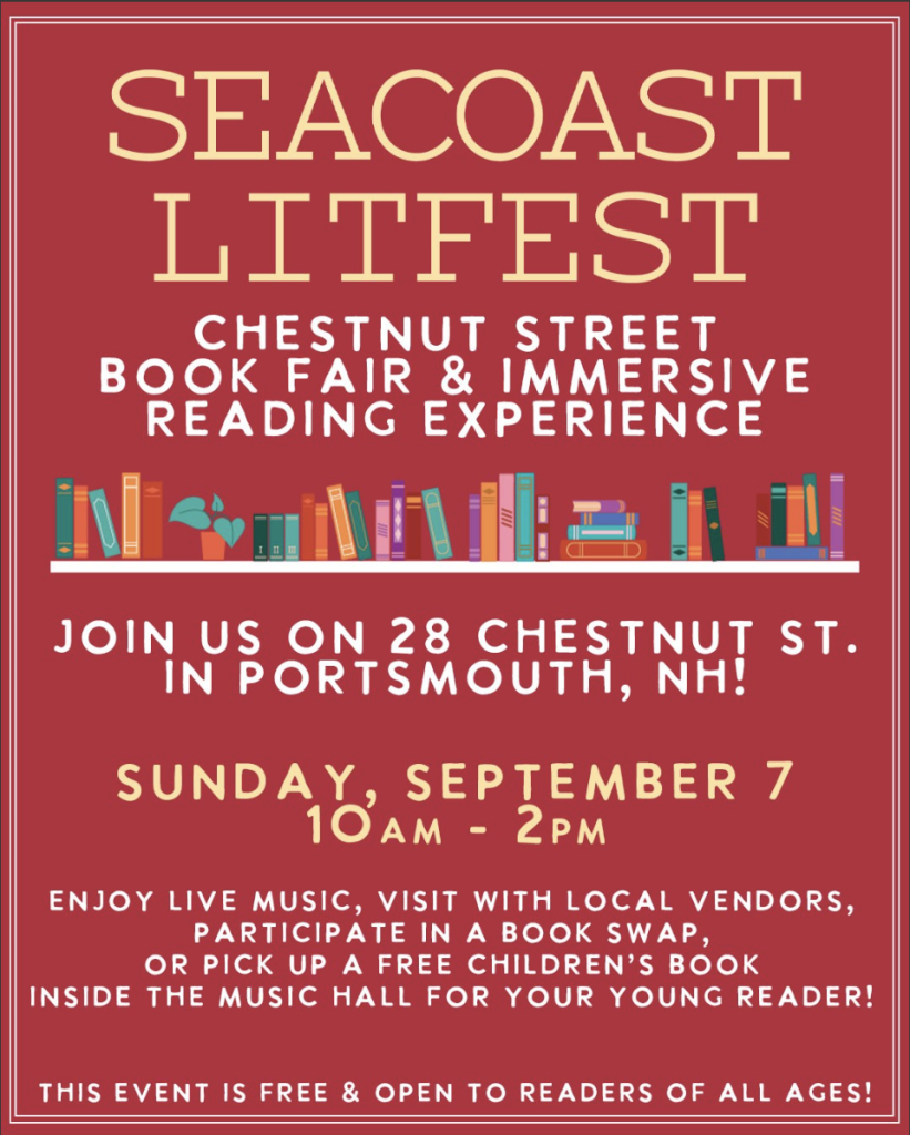 Seacoast LitFest, Chestnut St., Portsmouth – Looking for a family day out? Head to Seacoast LitFest Book Fair for live music, local vendors, a book swap, & free childrenโs books! 28 Chestnut Street, 10 a.m.-2 p.m. https://www.themusichall.org/seacoast-litfest/
