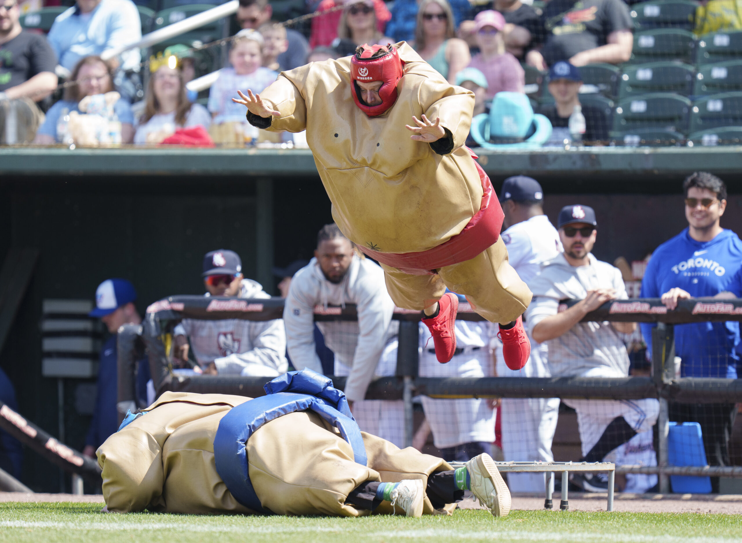 Perhaps the most recognizable feature between innings is something that Marais, literally, stumbled upon one day when he found two unused Sumo wrestler suits in the clubhouse.