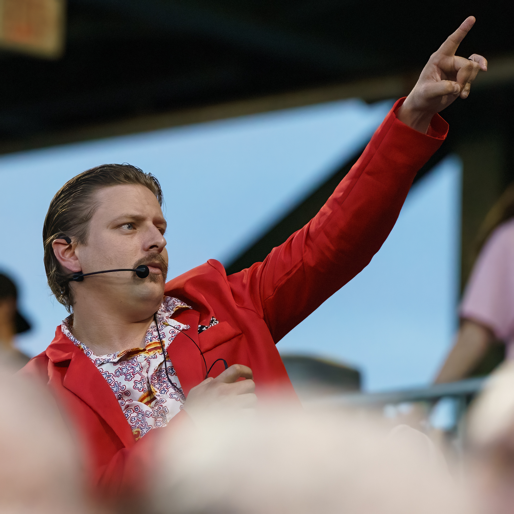 Marais has now added his own signatures to the position, including wearing eccentric outfits—particularly jackets—that his wife Stephanie helps him choose. Alongside his colleague and production director Amy Cecil, the duo put on a show between innings that includes trivia, races and promotions for the crowd.