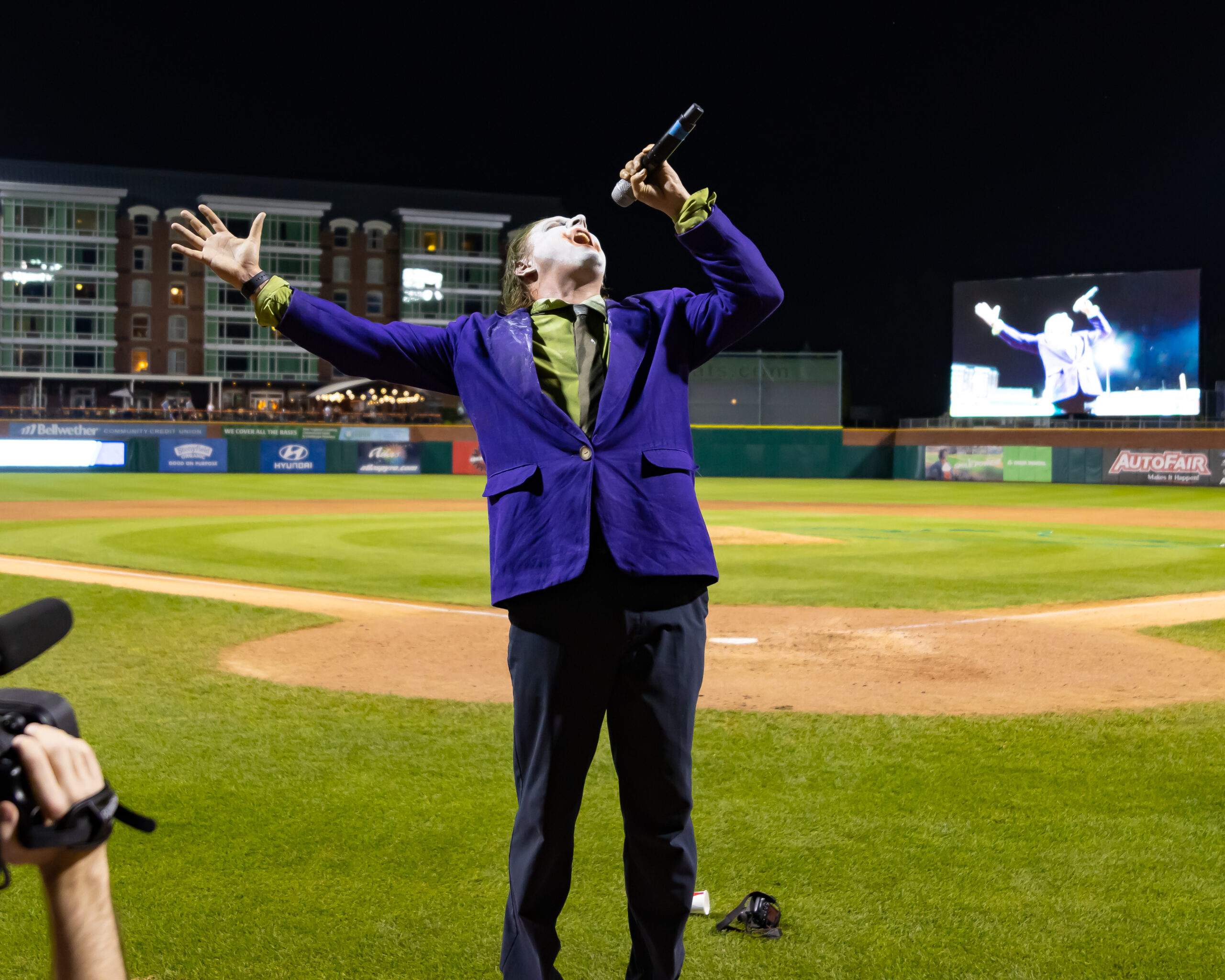 Standing along the first base line, Andrew Marais—the 32-year-old on-field emcee and the Senior Manager of Marketing and Promotions with the Fisher Cats organization—dons a bright blue blazer with his face painted white and his hair dyed green to resemble The Joker from the “Batman” series.