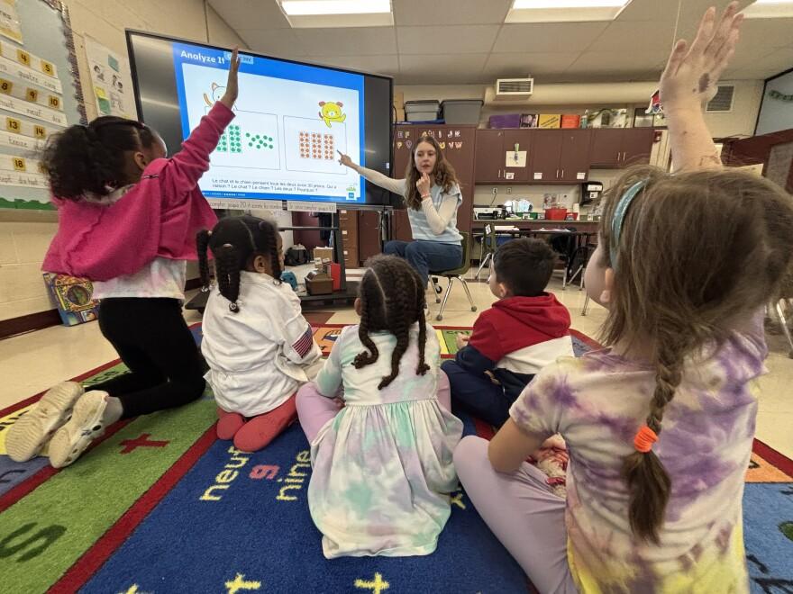 NHPR Kindergarten students learn math in French in Jacqueline Gleason-Boure’s classroom at Weston Elementary School in Manchester. Photo/Annemarie Timmons