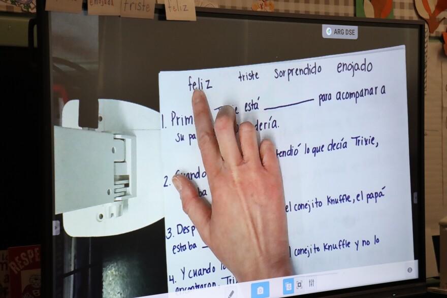 First graders fill in the missing words in a grammar lesson taught in Spanish. Elena Eberwein / NHPR