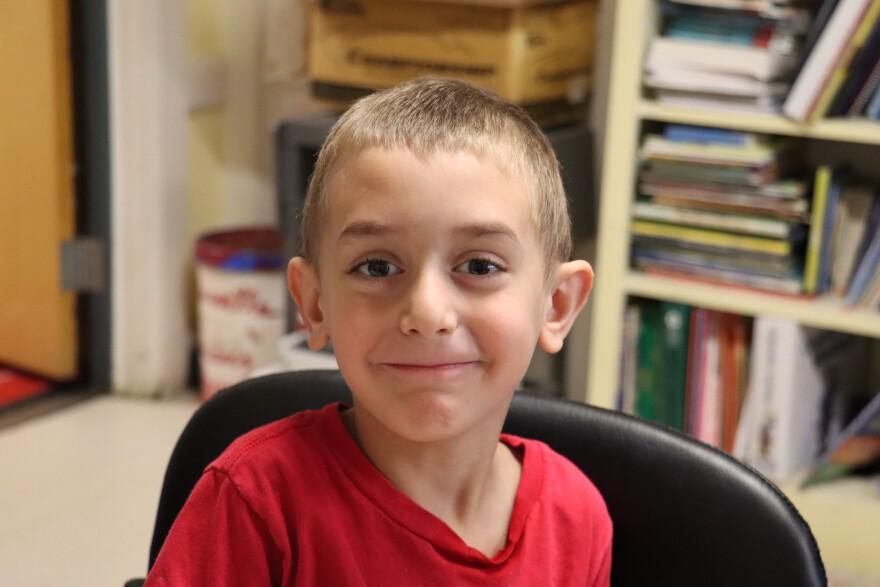 First grader Elijah Neidorf uses the Spanish he’s learning in Manchester’s language immersion program to play with his Spanish-speaking neighbors. Photo/Elena Eberwein / NHPR