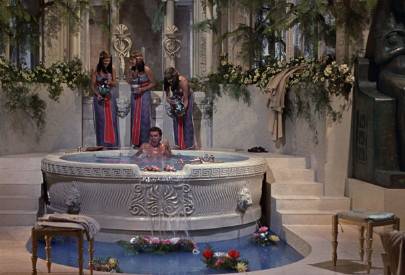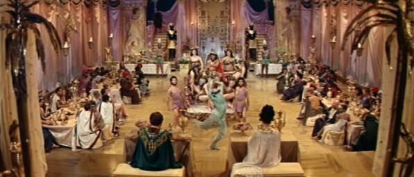 Sets created by Academy Award-winning John De Cuir, “Cleopatra” is saturated in extravagance. One in particular was her lavish gold barge. Feminine in architecture, pink incense surrounds it and handmaidens throw petals into the water as a sign of welcome; it is both alluring and seductive. The banquet held for Lord Antony is luxurious where Cleopatra flexes her feminine mystique in an attempt to beguile Antony, of which she, of course, succeeds.