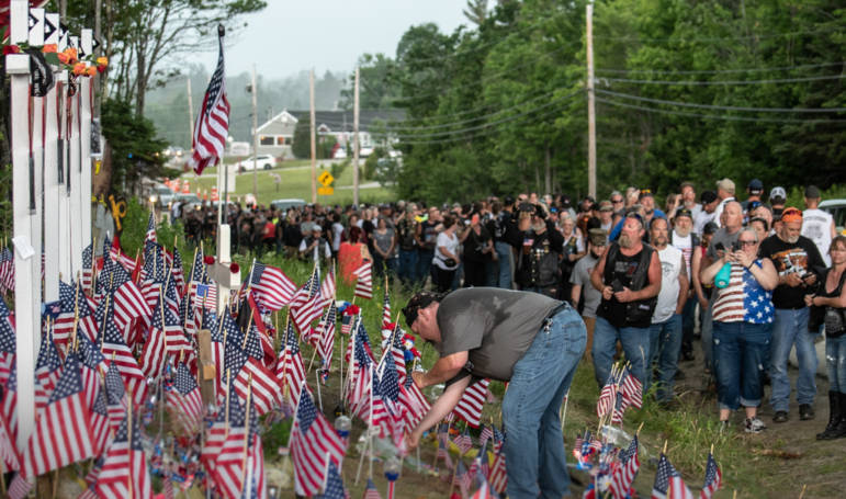Bikers gathered initially at one of 15 meet-up points, and then assembled at the Broken Spoke Salon in Laconia to ride together to the memorial site, where they held a memorial service, despite stormy weather, and heavy rain at times.