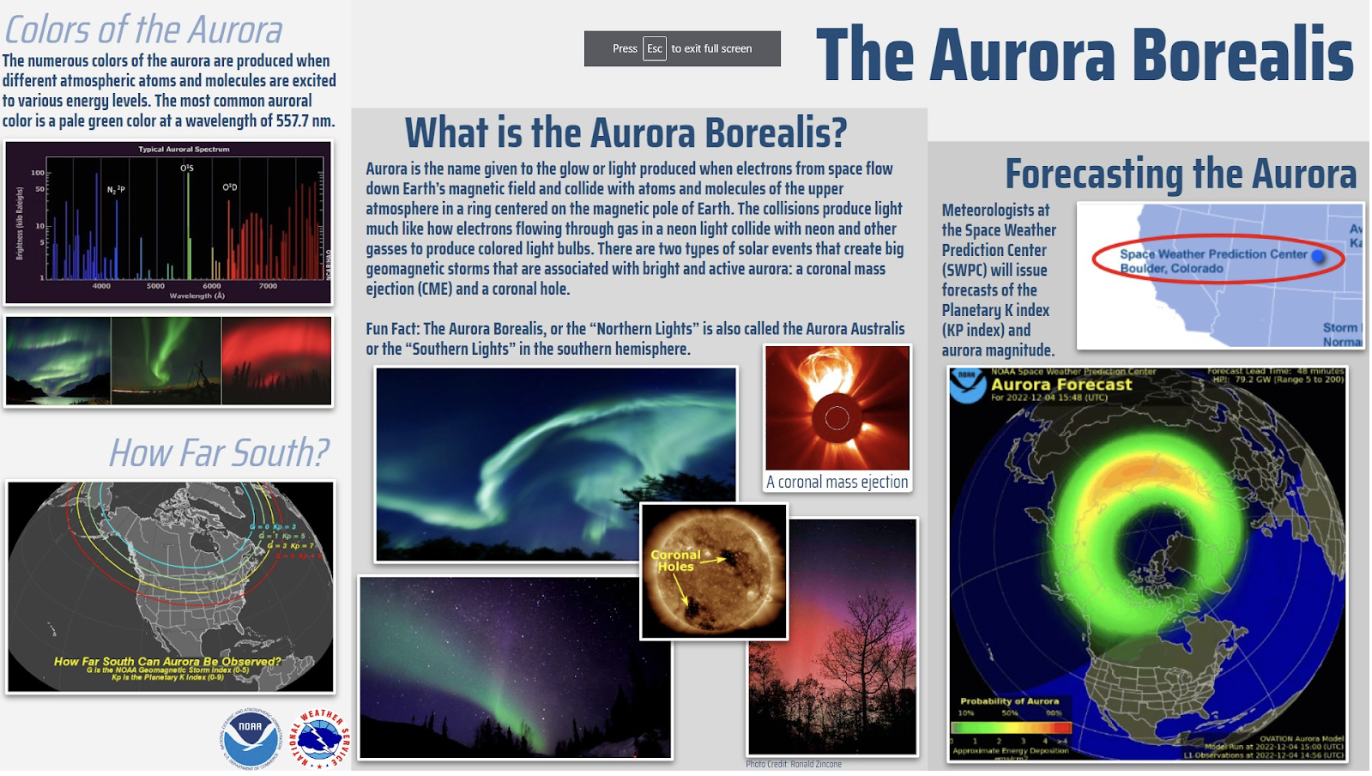 Aurora Borealis or โ€œNorthern Lights.โ€ Fun fact: this phenomenon is also called the Aurora Australis or the โ€œSouthern Lightsโ€ in the southern hemisphere. Aurora is the name given to the glow or light produced when electrons from space flow down Earthโ€™s magnetic field and collide with atoms and molecules of the upper atmosphere in a ring centered on the magnetic pole of Earth. The collisions produce light much like how electrons flowing through gas in a neon light collide with neon and other gasses to produce colored light bulbs. There are two types of solar events that create big geomagnetic storms that are associated with bright and active aurora: a coronal mass ejection (CME) and a coronal hole. For more information check out the graphic above!