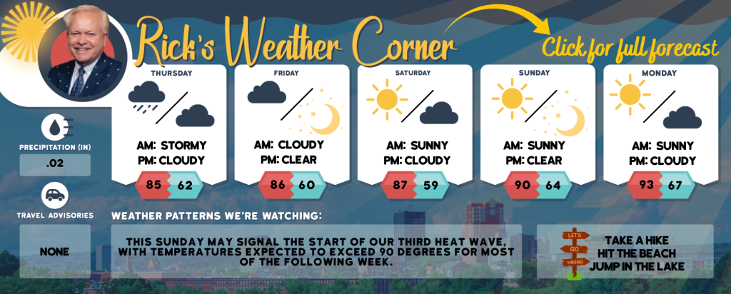 Sunday: Mostly sunny, hot, and turning more humid. High 90 (feel like 95) Winds: Light & Variable