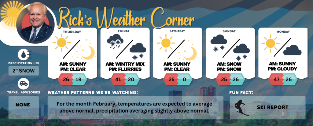 Sunday (Ground Hog Day): Not as cold with snow and flurries during the afternoon. High 26 (feel like 21) Winds: S 5-10 mph