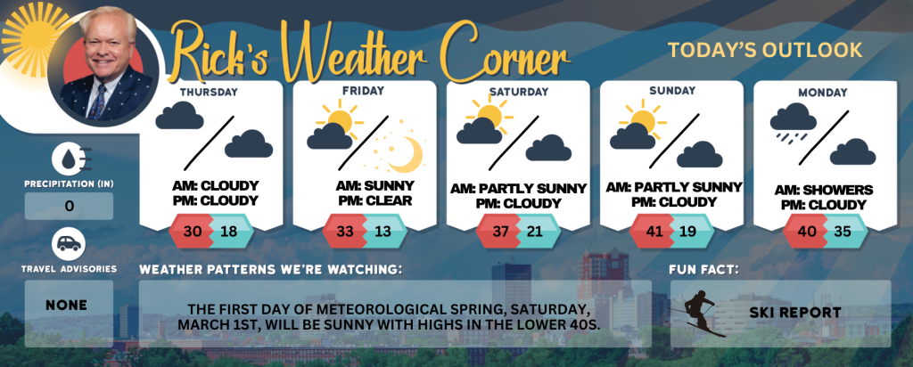 The first day of Meteorological Spring, Saturday, March 1st, will be sunny with highs in the lower 40s.