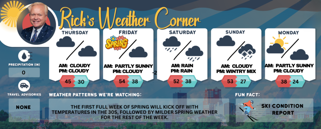 The first full week of spring will kick off with temperatures in the 30s, followed by milder spring weather for the rest of the week.