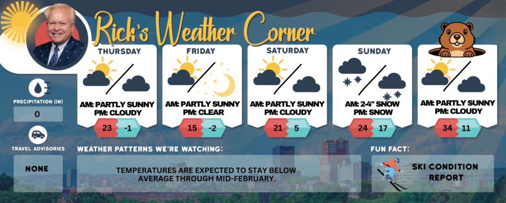 Monday (Groundhog Day): Windy with some sun and not as cold. High 34 (feel like 22) Winds: NW 15-20+ mph