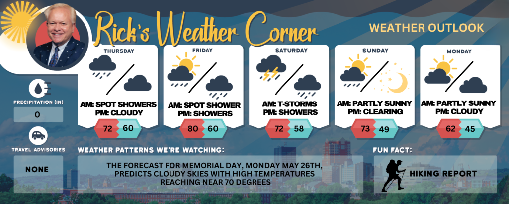 The forecast for Memorial Day, Monday May 26th, predicts cloudy skies with high temperatures reaching near 70 degrees.