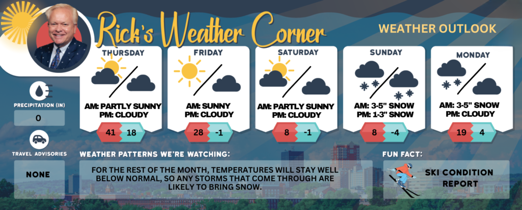 Sunday: Cloudy and frigid with snow (3-5″) developing. High 12 (feel like 9) Winds: NNE5-10 mph