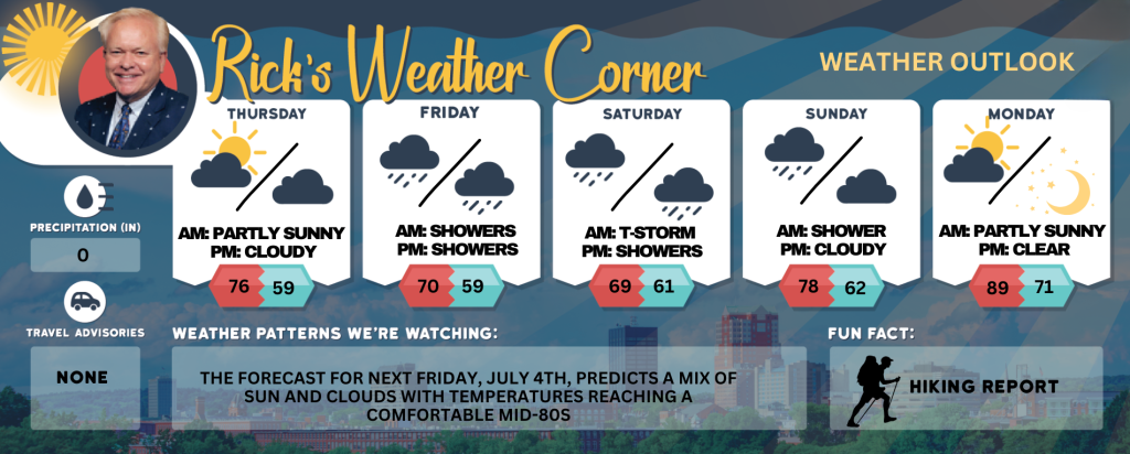The forecast for next Friday, July 4th, predicts a mix of sun and clouds with temperatures reaching a comfortable mid-80s.