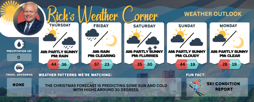How long will the break from freezing temperatures last, and could it spoil the chances of a white Christmas? As the week progresses, the chill will let up, with many areas seeing temperatures climb above the usual 39-degree average by Friday. Highs in the 50s and rain could dampen hopes for a white Christmas, as the current snow on the ground might melt away before the holiday. Still, some long-range forecasts hint at the possibility of snow next Tuesday.