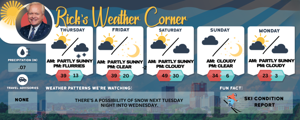 Today’s weather brings a delightful change, with temperatures not as cold and a blend of clouds and sunshine. Expect a high of 39 degrees, but with the wind chill, it’ll feel more like 30. Winds will be coming from the WNW at 10 to 15 mph, so bundle up a bit! Enjoy the mix as we transition into a brighter day!
