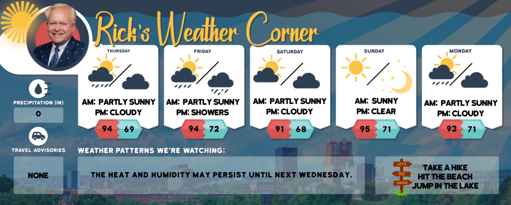 Sunday: Mostly sunny, hot, and humid. High 95 (feel like 98) Winds W 5-10 mph