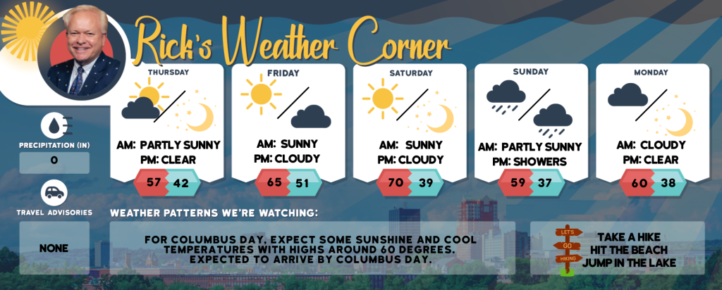 Columbus Day: Mostly cloudy & cool. High near 60 Winds: W 5-15 mph
