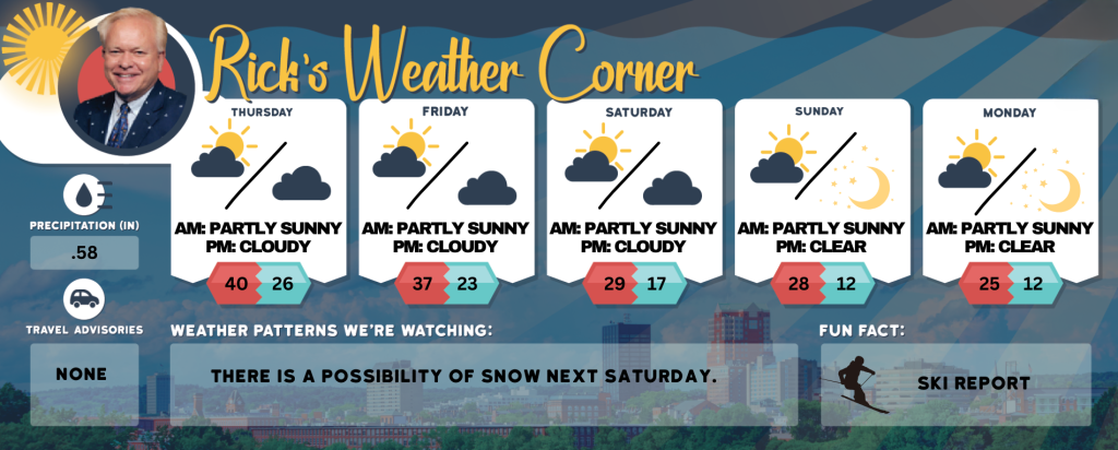 Saturday: Some sun and breezy. High 29 (feel like 17) Winds: WNW 15-20 mph