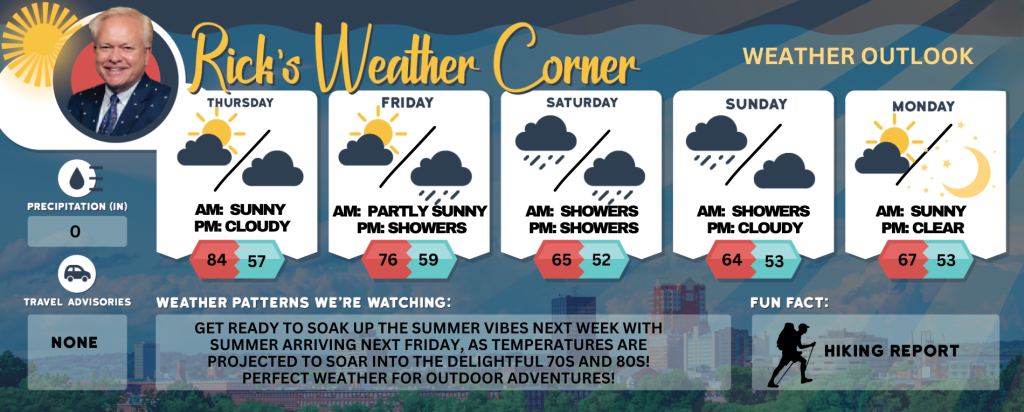 Get ready to soak up the summer vibes next week with summer arriving next Friday, as temperatures are projected to soar into the delightful 70s and 80s! Perfect weather for outdoor adventures!