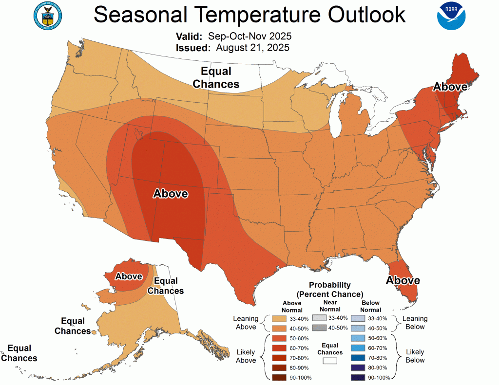 Meteorological Fall Temps Meteorological fall spans September, October, and November. The 90-day temperature outlook predicts above-average temperatures for this period.