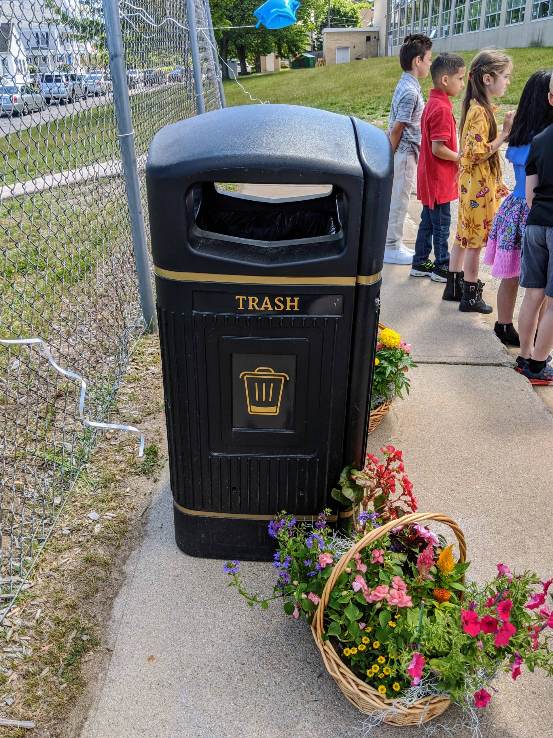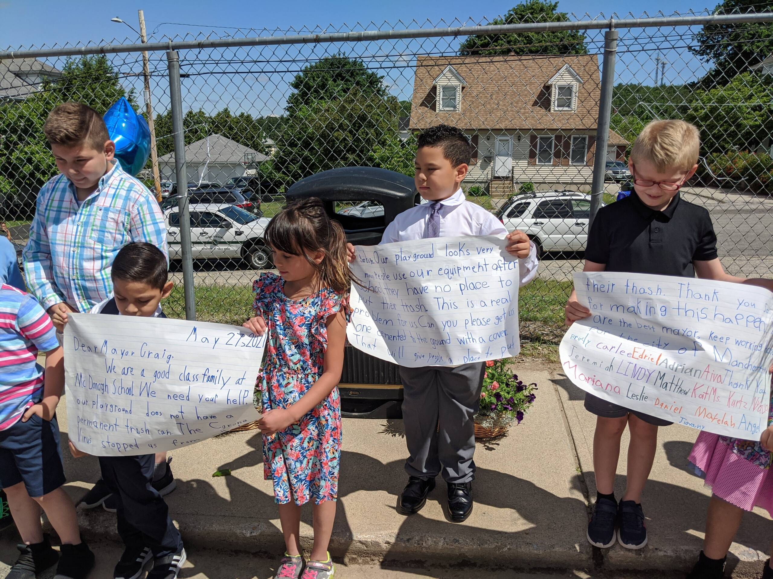 It’s not every day you get a giant three-page letter hand-written and signed by 17 kids requesting a trash can for their school, said Mayor Joyce Craig. “I couldn’t say no. And what a great lesson, for them to know they can make a difference.” The mayor was already planning to be at McDonough for their fifth-grade promotion ceremony on the last day of school and was able to stick around for an impromptu ribbon-cutting. She shook hands with each child and thanked them for taking the time to write her a letter. Public Works Director Kevin Shepard also stopped by to keep encouraging the kids to speak up when they see something around the city that needs fixing.