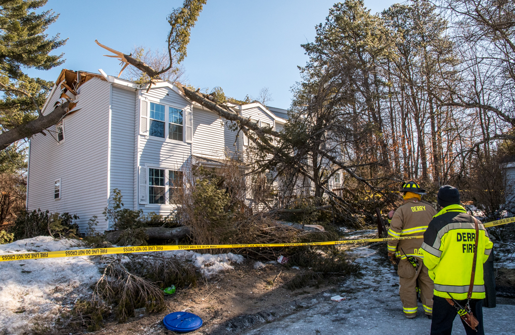 At 9:37 a.m., the Derry Fire Department responded to a call after a roughly 50-foot pine tree fell atop a three-unit condominium building at 107 Franklin Street.