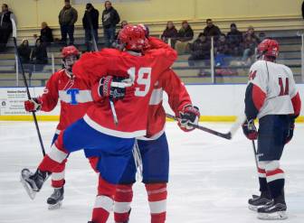 The Pioneers scored five of their goals early in each period, beginning with Nathan Arcand and Brandon Boss in the first, followed by Eric Favreau and Cam Laventure in the second and James Kosiarski in the third.