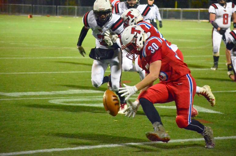 Trinity’s James Thibault scoops up one of the late fumbles.