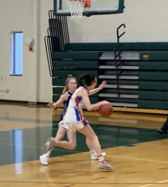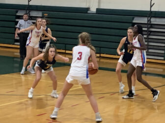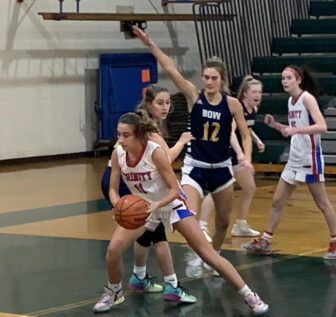 A 3-pointer by Bella LaPerle started the Falcons on their comeback, cutting the Trinity lead to 19-16. Tarsa then scored off a steal by Lindsay LaPerle before sticking a 12-foot jumper on the next possession to give Bow the lead, 20-19. But it was when Tarsa stole the ensuing inbounds pass and scored on a reverse layup to make it 22-19, that it was clear the momentum had swung in the Falcons’ favor.