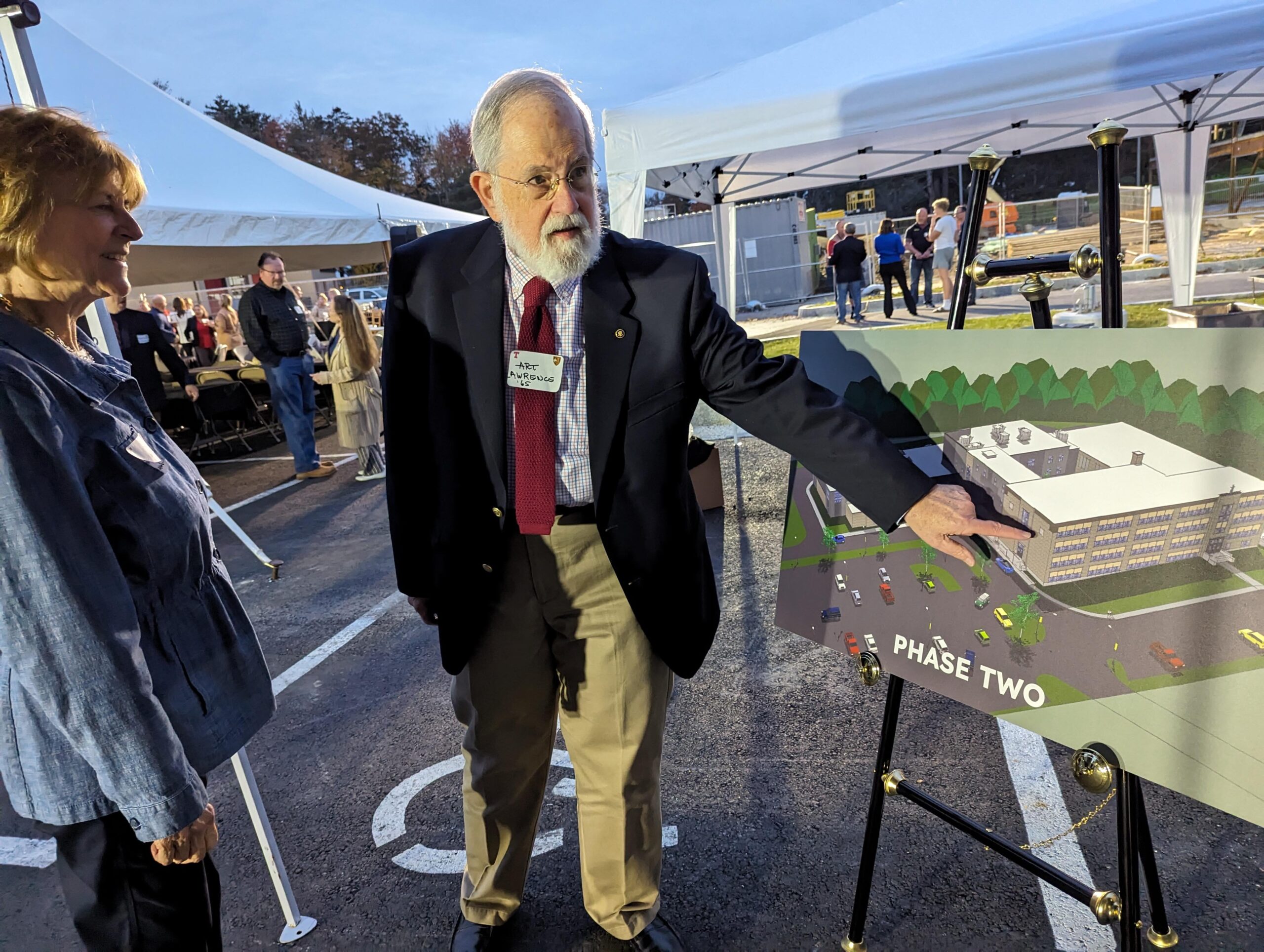 Following the ceremony Rear Admiral Arthur J. Lawrence was taking a closer look at the rendering of the building. Specifically, where the flagpole was to be placed.