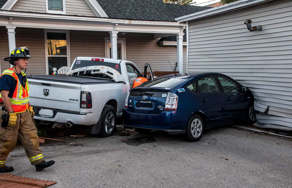 When crews arrived they found a pick-up truck into a porch and a Toyota Prius that had crashed into a garage. Firefighters and AMR medics evaluated the driver of the pick-up truck, who was not injured.