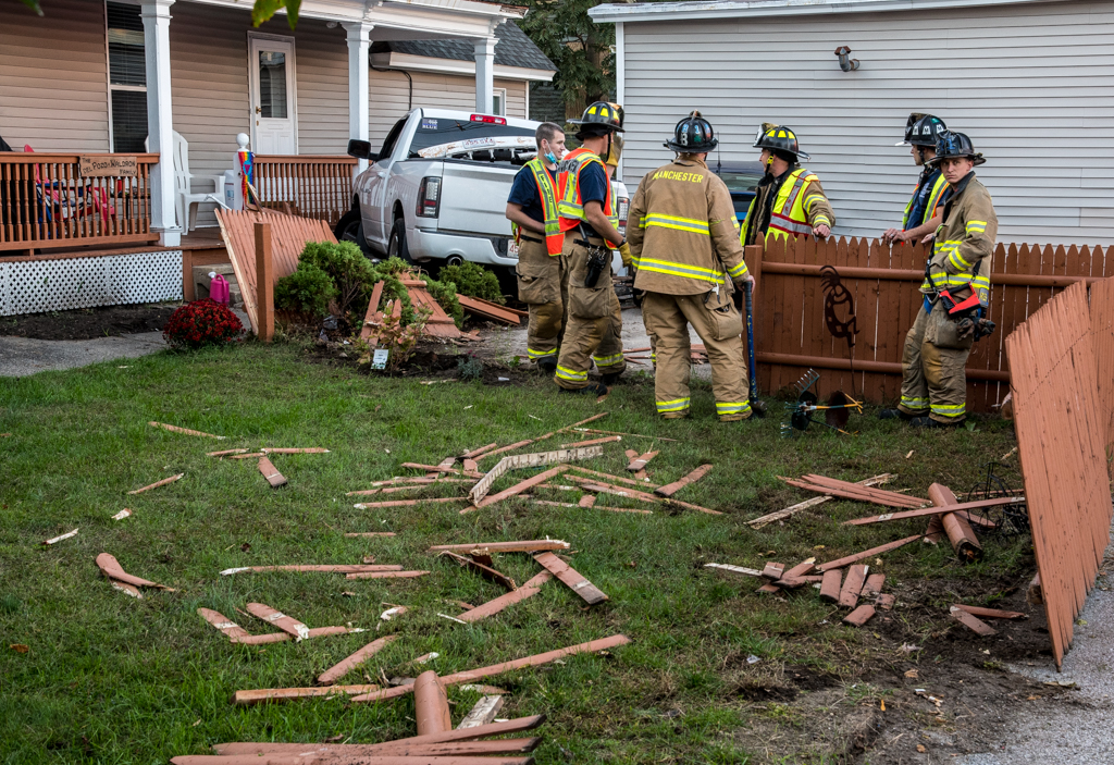 Firefighters assess the damage to a fence after a truck lost control on Maple Street and crashed through it. Photo/Jeffrey Hastings