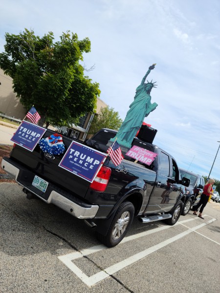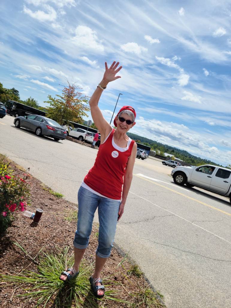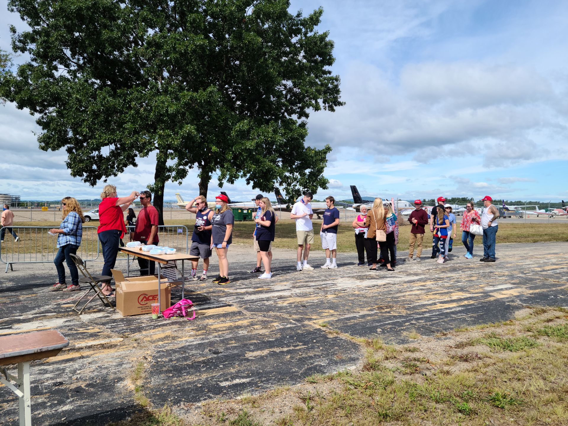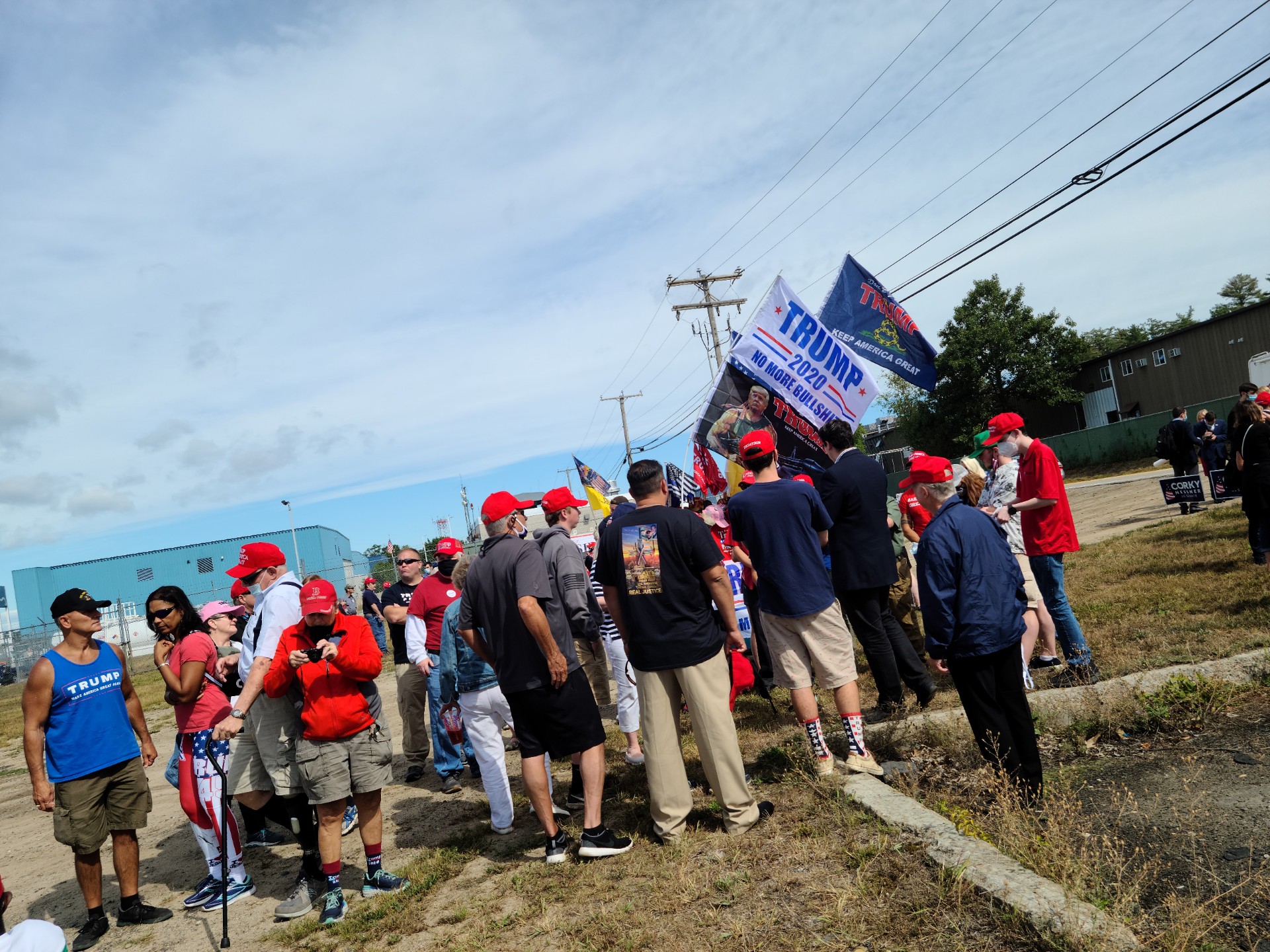 On Friday morning rallygoers were being instructed to park in the Longhorn restaurant parking lot at the Mall of New Hampshire where they would catch a shuttle to the hangar. Members of the press were instructed to go park at Dick’s Sporting Goods, also in the mall. A crew of volunteers were on duty with flags to direct rally traffic around the mall.