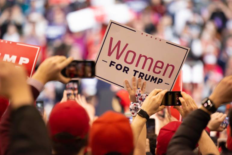 Prior to the president’s arrival, DeeDee Dorrington and Kelley Sardine, both of Billerica, Mass. danced and waved signs (Dorrington’s was “Women for Trump” while Sardine’s said “Promises Made” on one side, “Promises Kept” on the other).