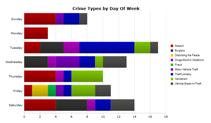 According to Crimemapping.com, Tuesday is the heaviest day for crime in Manchester, with the No. 1 crime being theft/larceny.