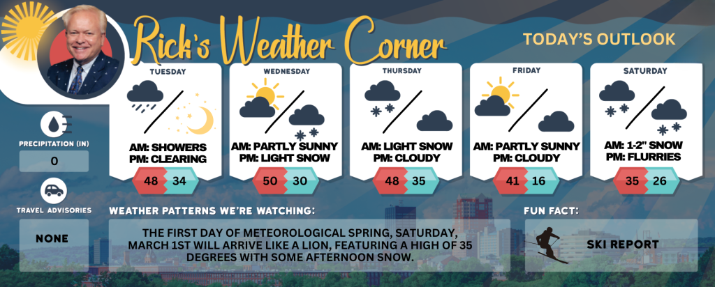 The first day of Meteorological Spring, Saturday, March 1st will arrive like a lion, featuring a high of 35 degrees with some afternoon snow.
