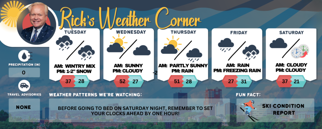 Today: Lots of clouds with snow in the afternoon, accumulating a coating to an inch or two. High 37 (feel like 32) Winds: S 5-15 mph