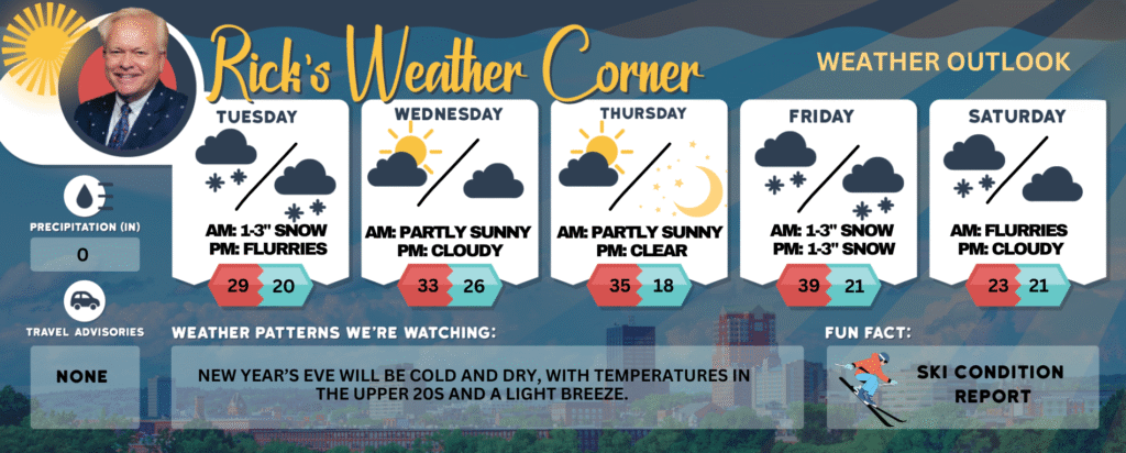 Christmas: Morning clouds with some afternoon sun. High 39 (feel like 35) Winds: WNW 5-10 mph