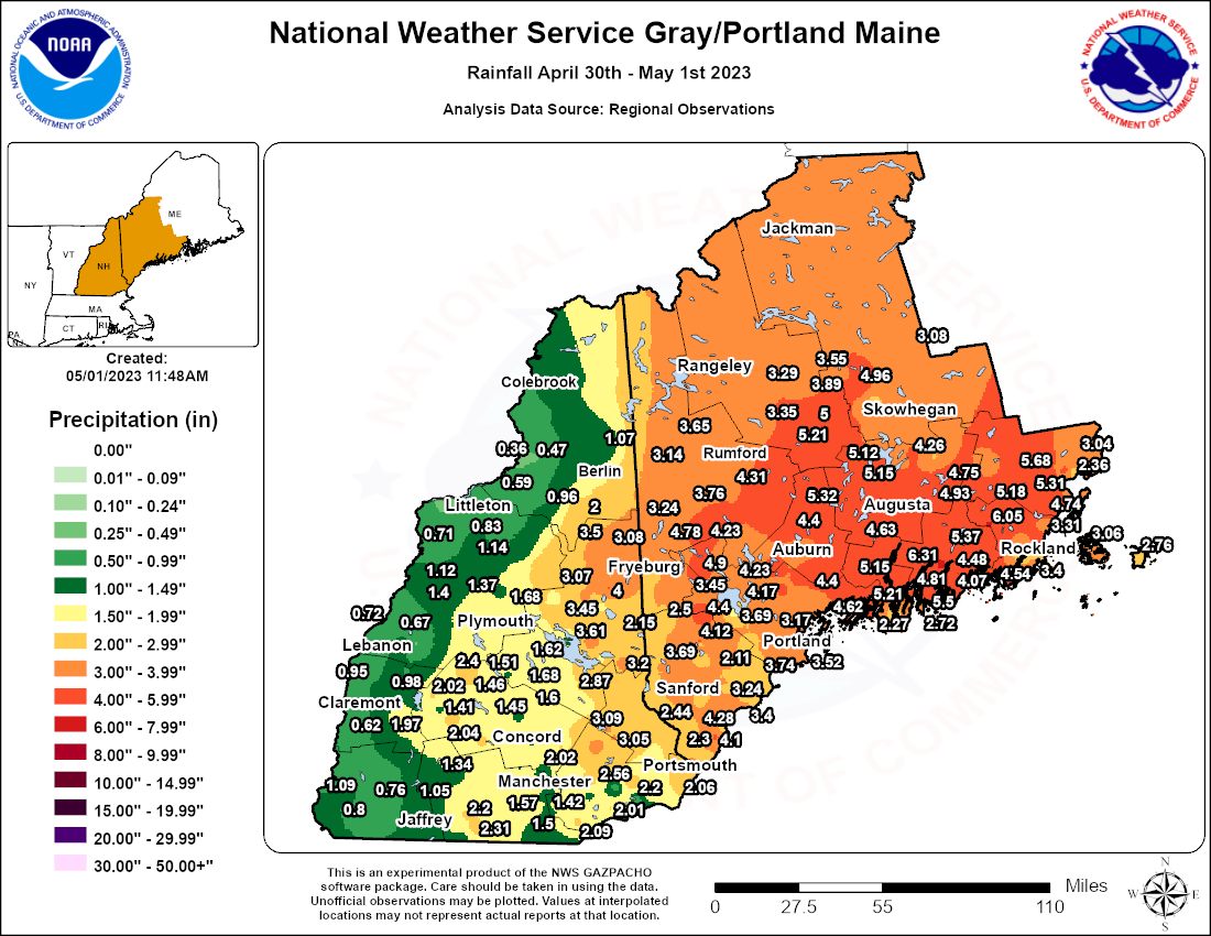 Sunday’s rainfall was 1.42″ breaking the record of 0.65″ set in 1948. Our sister town Manchester, Maine had 6.47″ of rain. Rainfall totals from Sunday to Monday morning for New Hampshire and Maine.