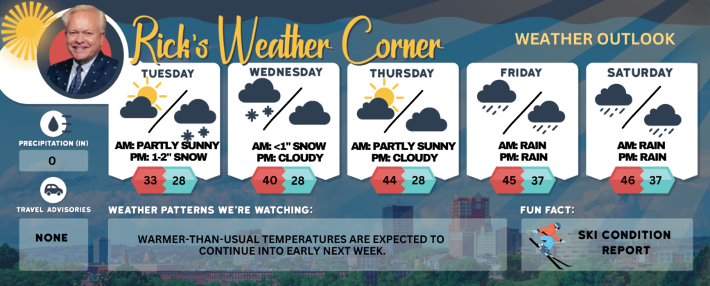Wednesday: Morning snow showers (less than inch) with some afternoon sun. High 40 (feel like 36) Winds: NW 5-10 mph