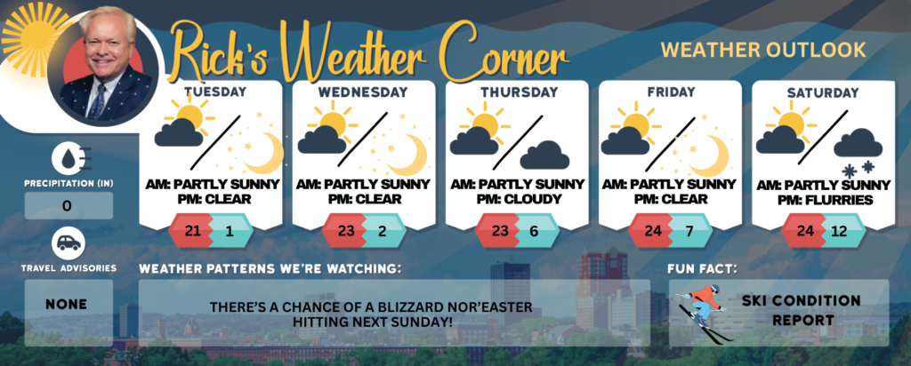 Saturday: Cold with a mix of sun & clouds. High 24 (feel like 14) Winds: NW 5-10 mph