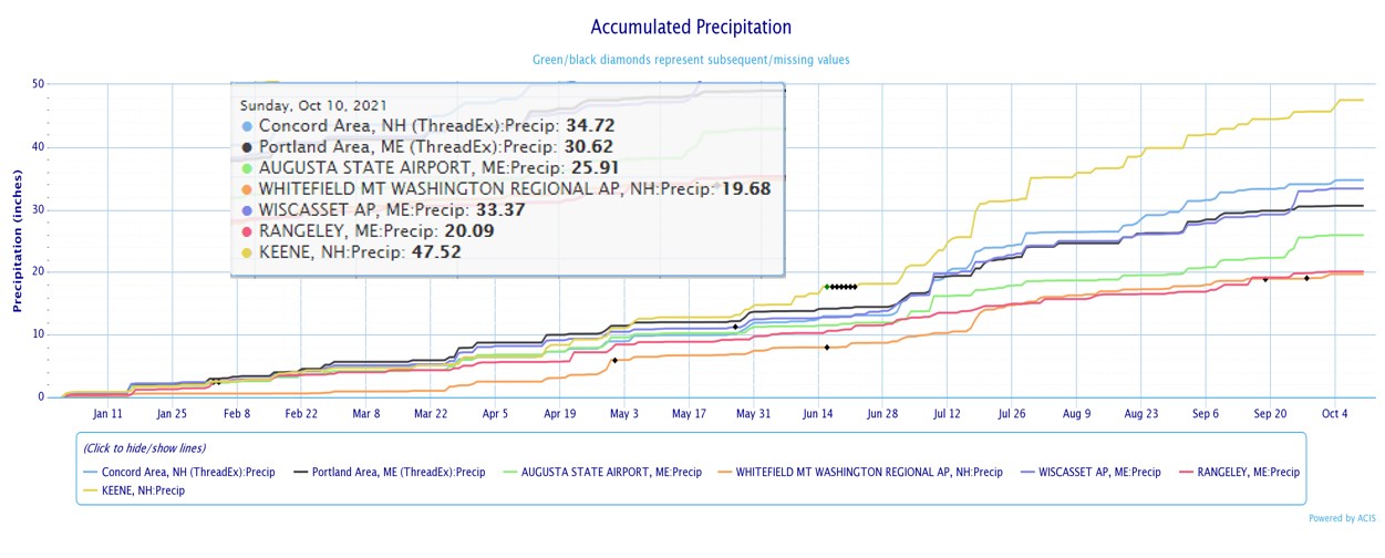 Yearly rainfall totals across New Hampshire for 2021 have been extreme thus far. You can see Keene has received 47.52″ of rain, while Whitefield has only received 19.68.”